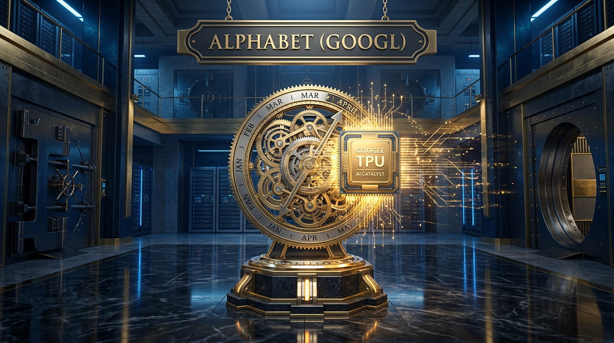 A glowing golden and steel calendar mechanism transitioning into a futuristic, glowing AI processing chip inside a blue financial vault, representing Alphabet's earnings catalyst.
