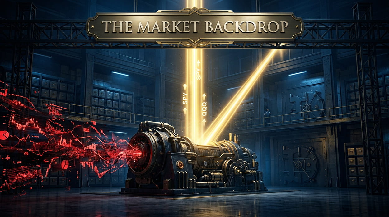 A conceptual visualization inside a financial vault showing a powerful golden beam of light labeled 'GROWTH LEADERSHIP' cutting through chaotic, noisy red data streams.
