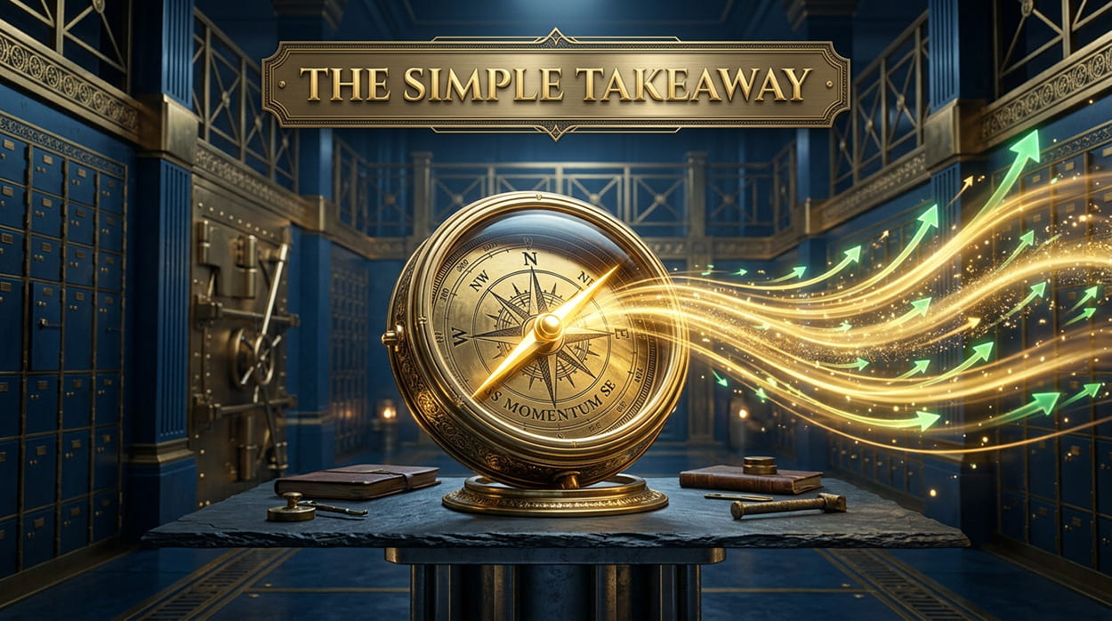 A majestic brass nautical compass with a glowing needle pointing into a powerful, blowing stream of golden light representing clear seasonal tailwinds.