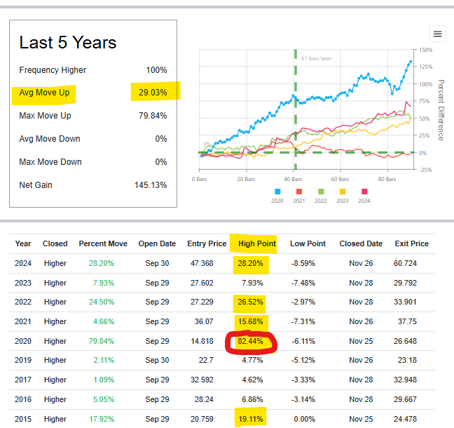 Below is a Cumulative Chart of the average move. The stock has a tendency to finish strong into the year-end…