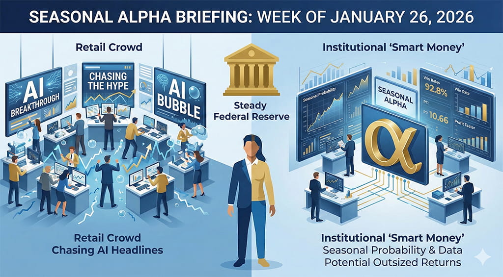 We are currently looking into the Week of January 26, 2026. The macro environment is characterized by a “bifurcated consumer” and a steady Federal Reserve. While the retail crowd chases the latest AI headlines, institutions are looking at Seasonal Probability and their underlying statistics to potentially provide an edge.