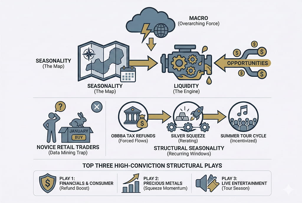 Many ‘novice’ retail traders treat seasonality as a magic trick—they see a stock has gone up 80 or 90% of the time in January and they blindly hit “buy.” That is highly likely a recipe for the Data Mining trap. To find truer alpha, you have to look for Structural Seasonality—recurring windows where capital flows are forced or incentivized by fundamental cycles.